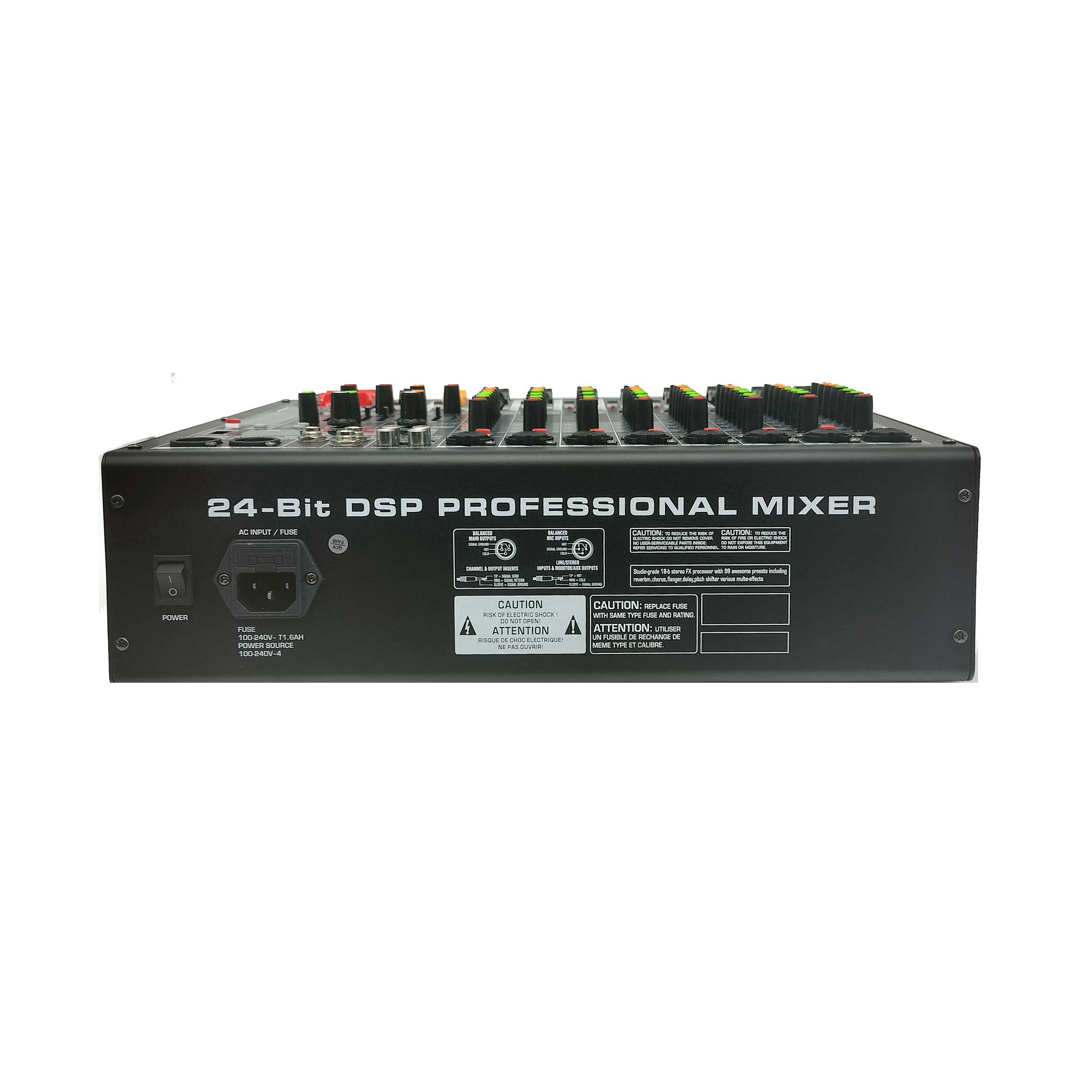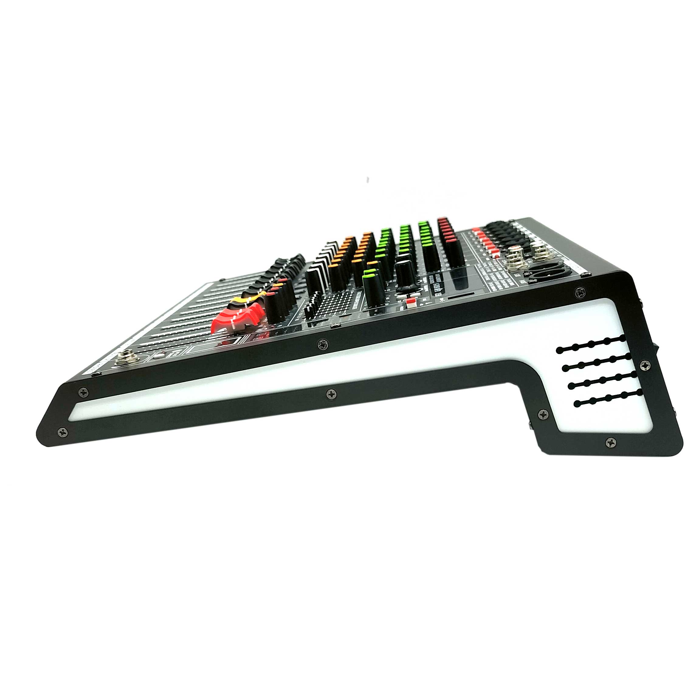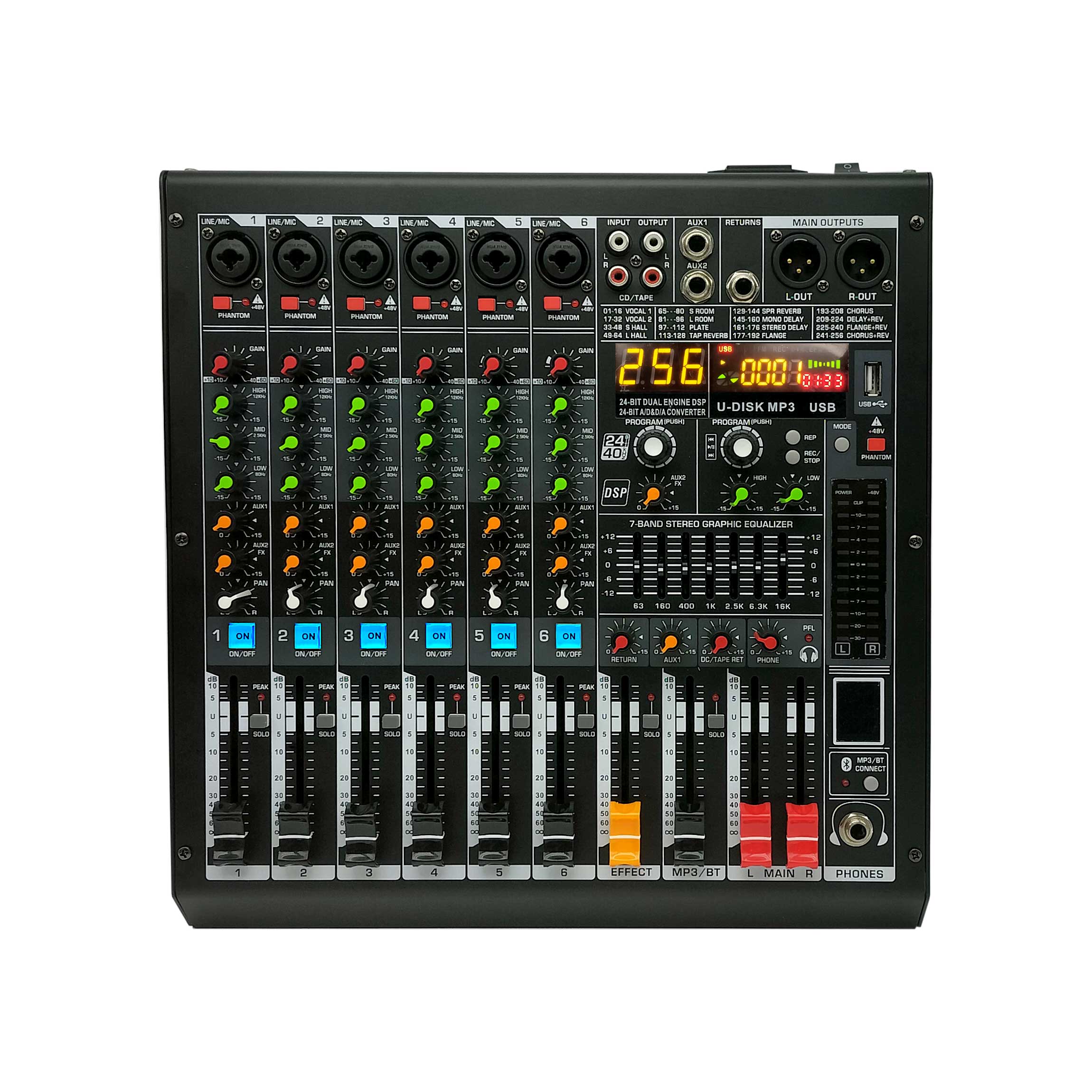 FX reverberation adjustment, built-in 256 kinds of DSP digital reverberation effects, equipped with adjustable parameter knobs to adjust parameters such as reverberation length and frequency response.