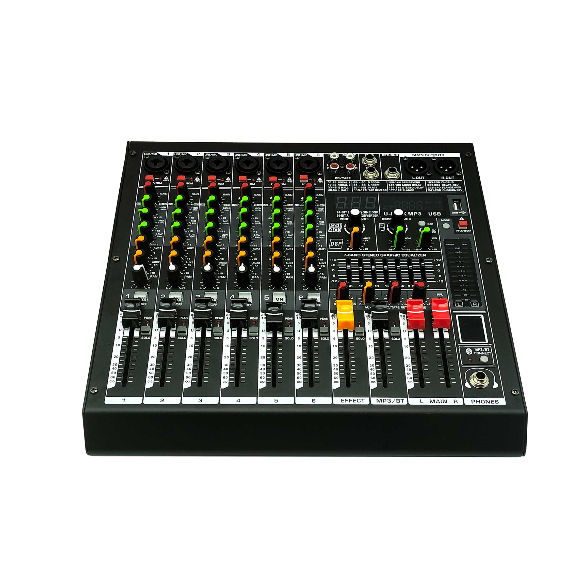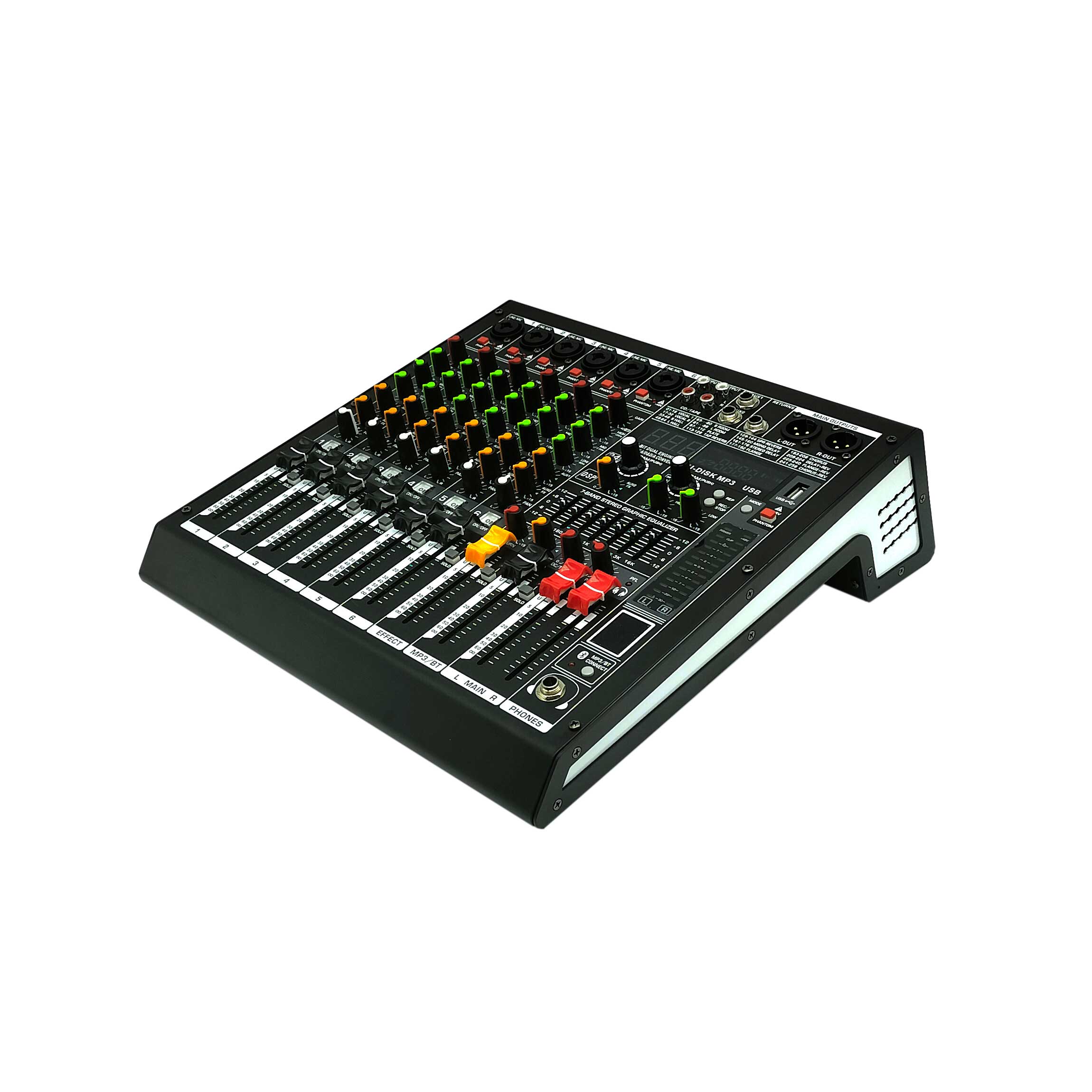 With Bluetooth playback, MP3 with digital display (can record/playback via USB disk and playback/recording via USB computer) and can control the volume with separate faders.
