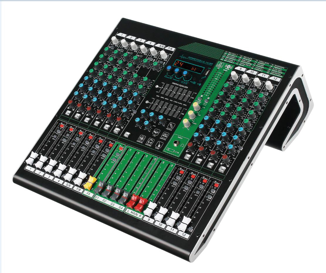 ●16-channel design, 12 MIC mono channels + 2 stereo inputs